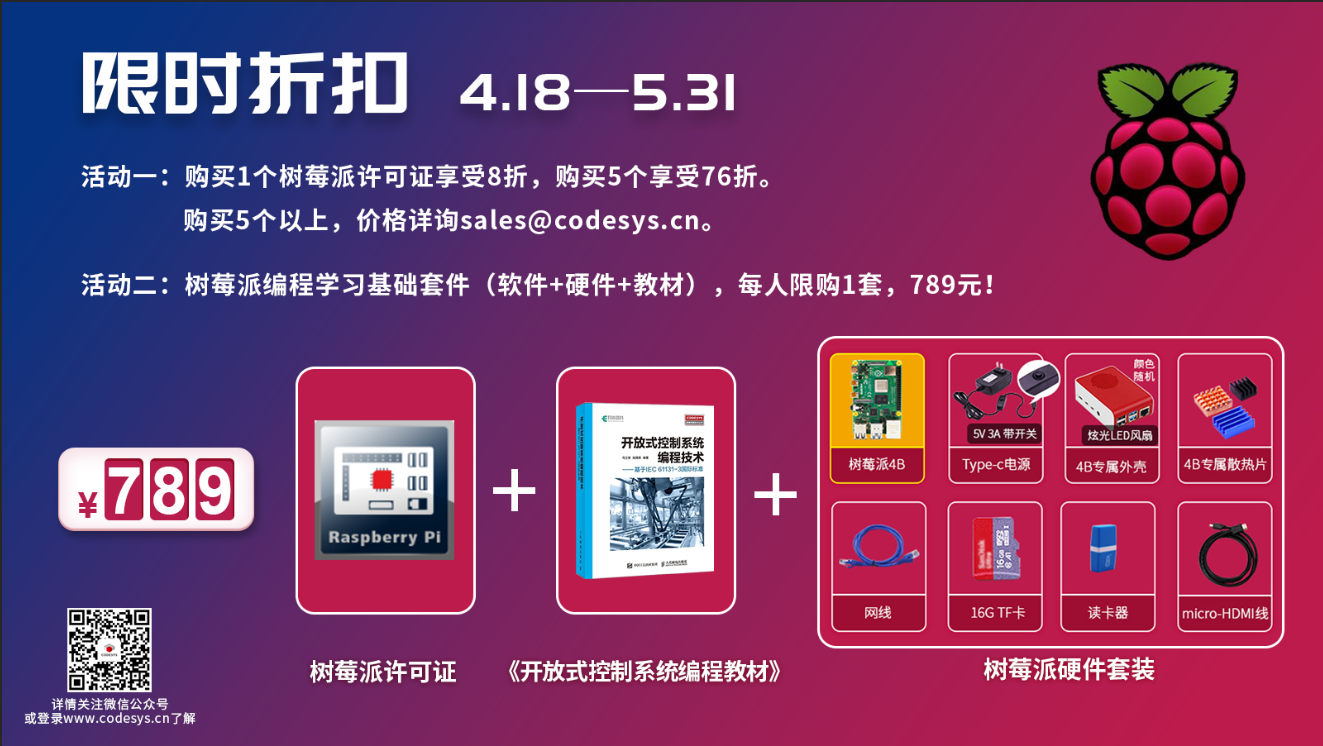 2)樹莓派基本套餐(軟件+硬件+套餐書籍),每人限購1套,789元!限時:4.18-5.31 報名預(yù)定請聯(lián)絡(luò) sales@codesys.cn。