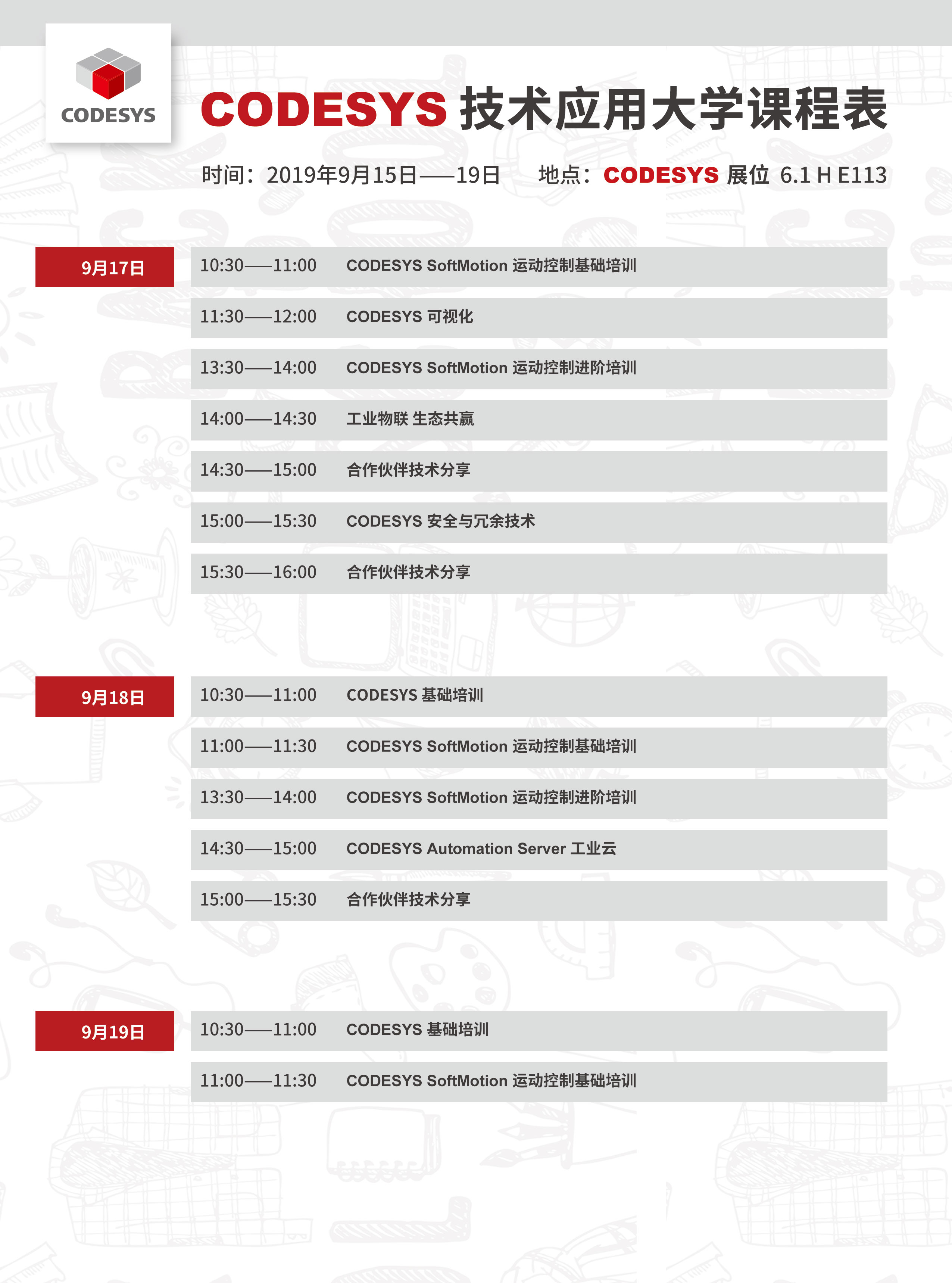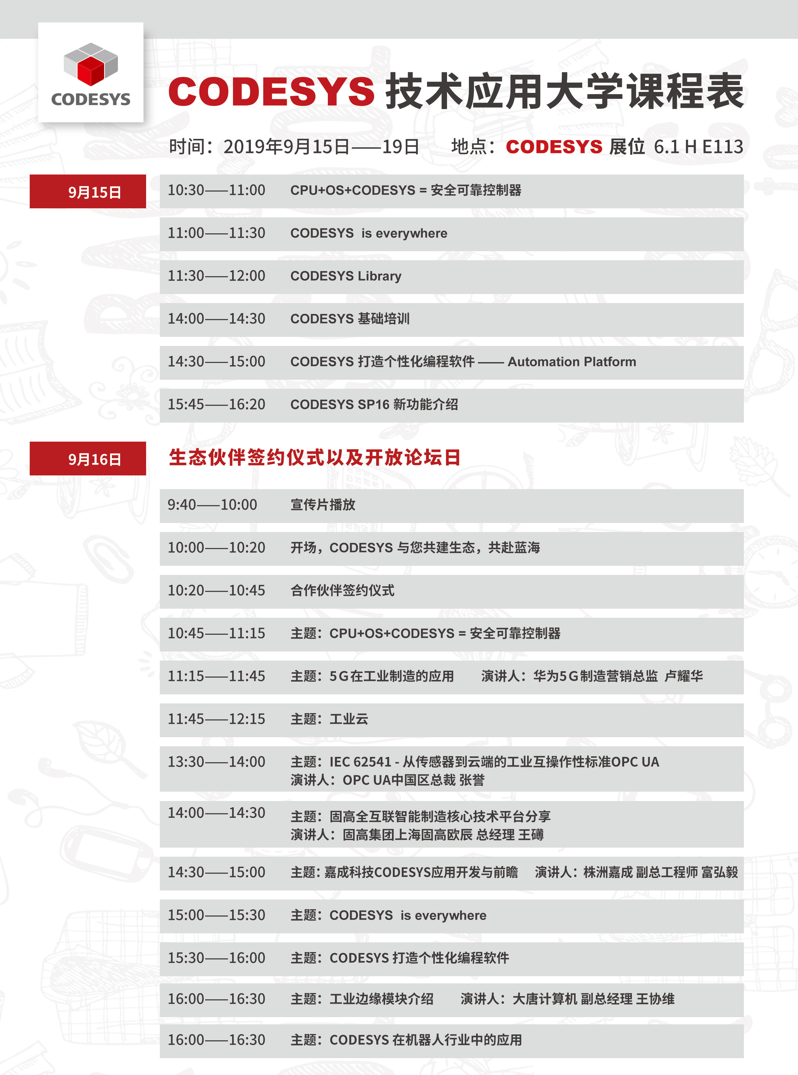 2020年9月15-19日,CODESYS將在上海舉辦的中國國際工業(yè)博覽會展位現(xiàn)場為大家再次帶來CODESYS技術(shù)應(yīng)用大學(xué)現(xiàn)場免費(fèi)培訓(xùn)!