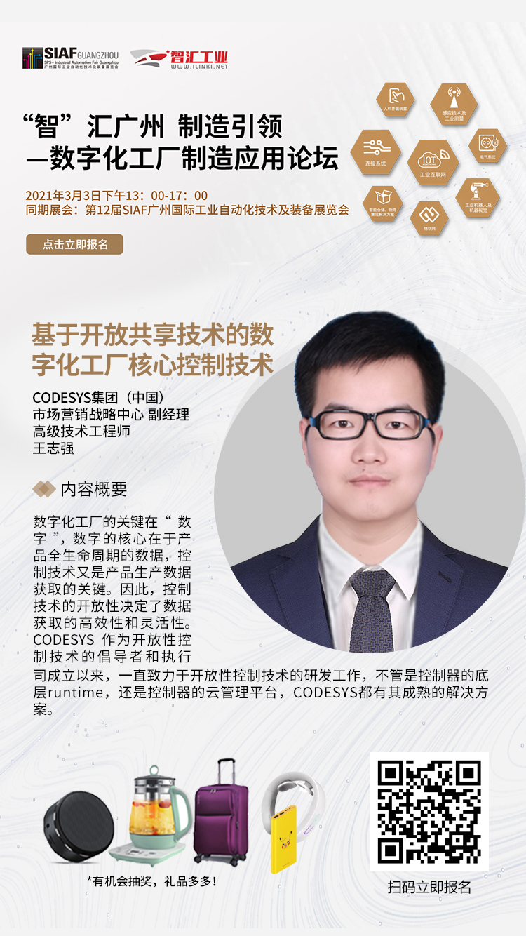 2021年3月3日-5日,SIAF(廣州國際工業(yè)自動化技術(shù)及裝備展)將在廣州中國進(jìn)出口商品交易會展館B區(qū)舉行。CODESYS 受邀參加展會同期論壇:“智”匯廣州,制造引領(lǐng) - 數(shù)字化工廠制造應(yīng)用論壇,分享 CODESYS 數(shù)字化工廠整體解決方案。