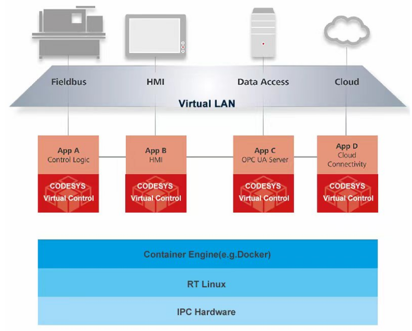 CODESYS 軟件集團(tuán)發(fā)布了強(qiáng)大的工業(yè)云產(chǎn)品和虛擬控制技術(shù)方案,可為用戶提供基于云的控制器(PLC)開發(fā)及管控方案和工業(yè)云服務(wù)。CODESYS Virtual Control 解決方案集成了許多先進(jìn)的IT技術(shù),如 Containers, Hypervisor, Kubernetes, OPC UA, Web 協(xié)議等技術(shù)。CODESYS 虛擬控制解決方案可根據(jù)客戶的確定性和實(shí)時(shí)性需求,既可以在傳統(tǒng)控制器中部署運(yùn)行,也可以在邊緣服務(wù)器、私有云或公有云服務(wù)器中部署運(yùn)行。實(shí)踐了“硬件平臺(tái)提供資源,軟件系統(tǒng)定義功能”的理念。CODESYS Virtual Control SL將向用戶提供一個(gè)獨(dú)立于硬件的 Runtime。從小型、專用的基于ARM CPU的控制器到強(qiáng)大的IT服務(wù)器群,該軟PLC都支持部署運(yùn)行。同時(shí),用戶可根據(jù)需求在數(shù)量和性能上對(duì)該 Runtime 進(jìn)行擴(kuò)展。目前,CODESYS Runtime每天都穩(wěn)定運(yùn)行在遍布全球的數(shù)百萬個(gè)控制系統(tǒng)和自動(dòng)化設(shè)備中,而 CODESYS 虛擬控制技術(shù)使 CODESYS Runtime更加獨(dú)立于硬件,并使 CODESYS Runtime能夠在容器 (如Docker )和 Hypervisor 平臺(tái)中穩(wěn)定地實(shí)時(shí)運(yùn)行。