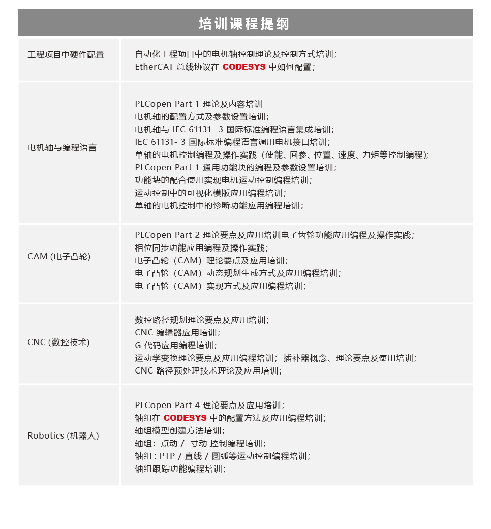CODESYS V3 SoftMotion 課程以 CODESYS V3.5 SoftMotion CNC + Robotics 為主,詳細對使用 PLCopen 標準功能塊來控制數控設備及工業(yè)機器人等設備進行編程 培訓。